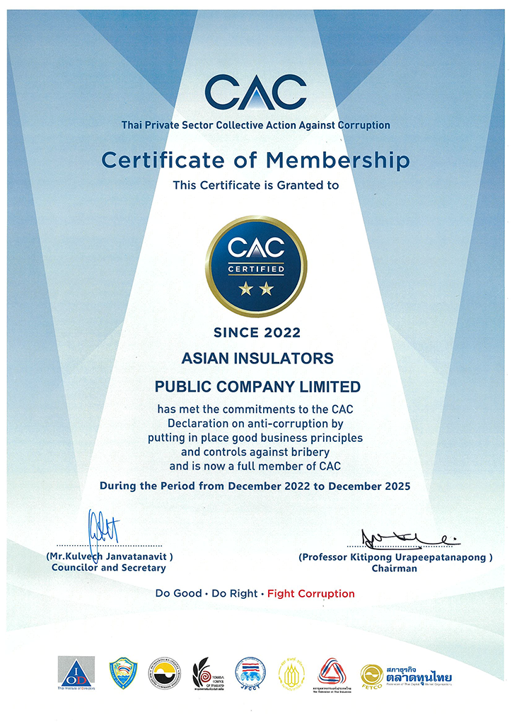 Asian Insulators Public Company Limited "The Company" recognizes the importance of conducting business in a transparent manner. To adhere to the principles of good corporate governance in order to operate effectively, fairly, socially responsible and stakeholders. And the anti-corruption corruption that may occur in every organization. The company has set the principles of business operations that do not support the business of the group or persons doing wrong in the pursuit of benefits. The Company Trusted in the conduct of business without corruption, the Company has established a policy of corruption. And to be a guide for the board of directors, executives and employees to strictly follow.
